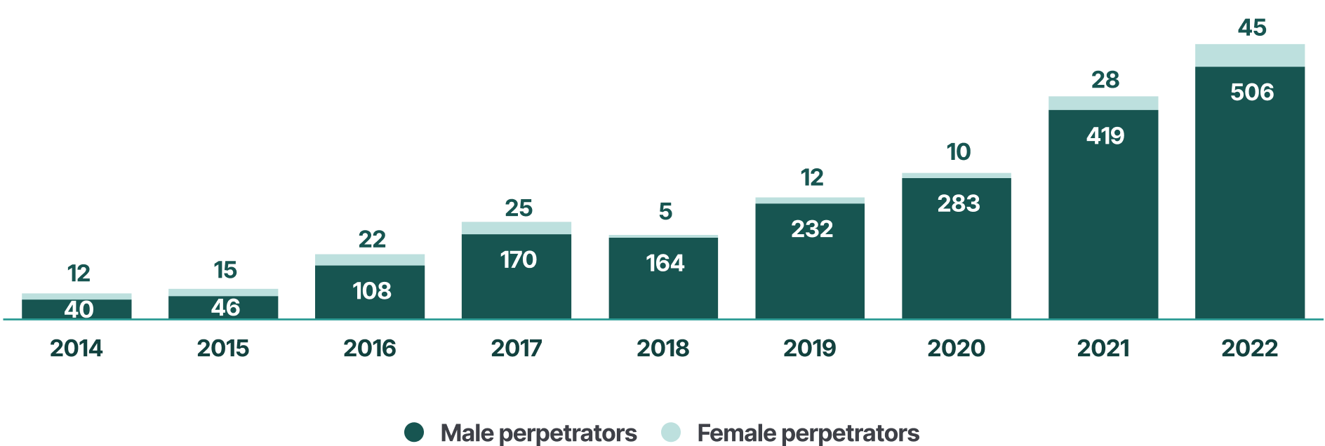 Figure 9 Annual number of male and female perpetrators in temporary residence ban cases involving domestic violence (2014-2022) (Indicator 10)
