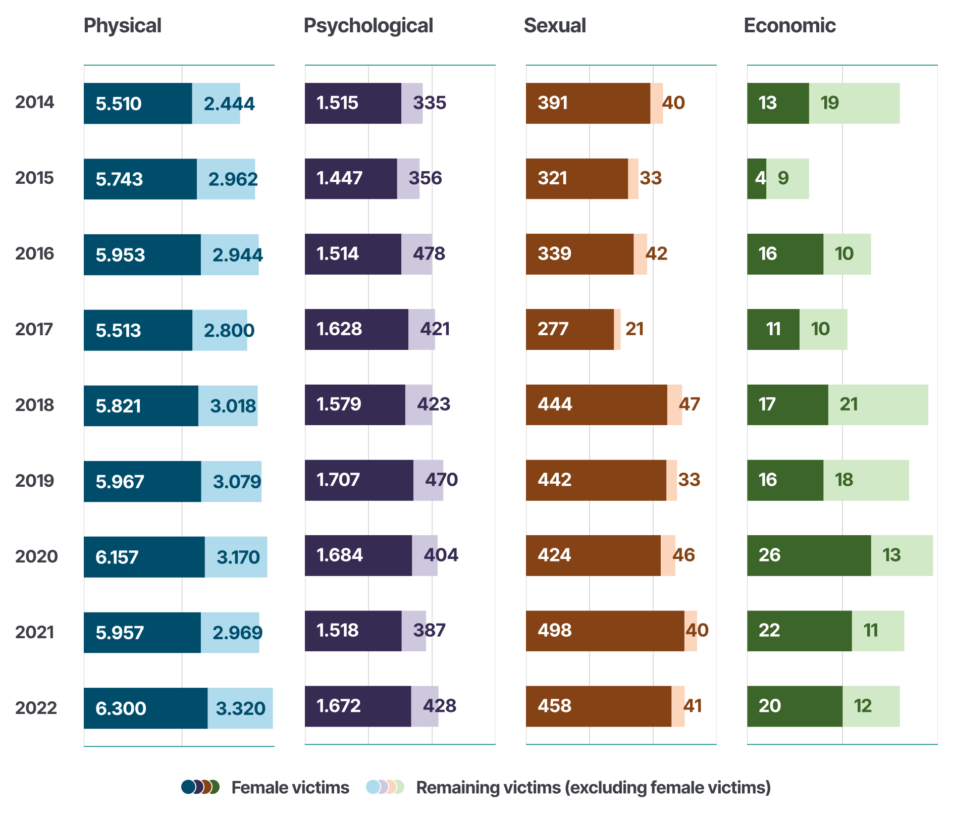 Figure 6 Annual number of female and total victims of physical, psychological, and sexual domestic violence (Indicators 4-6), and plaintiffs that have reported economic domestic violence (Indicator 7), 2014–2022