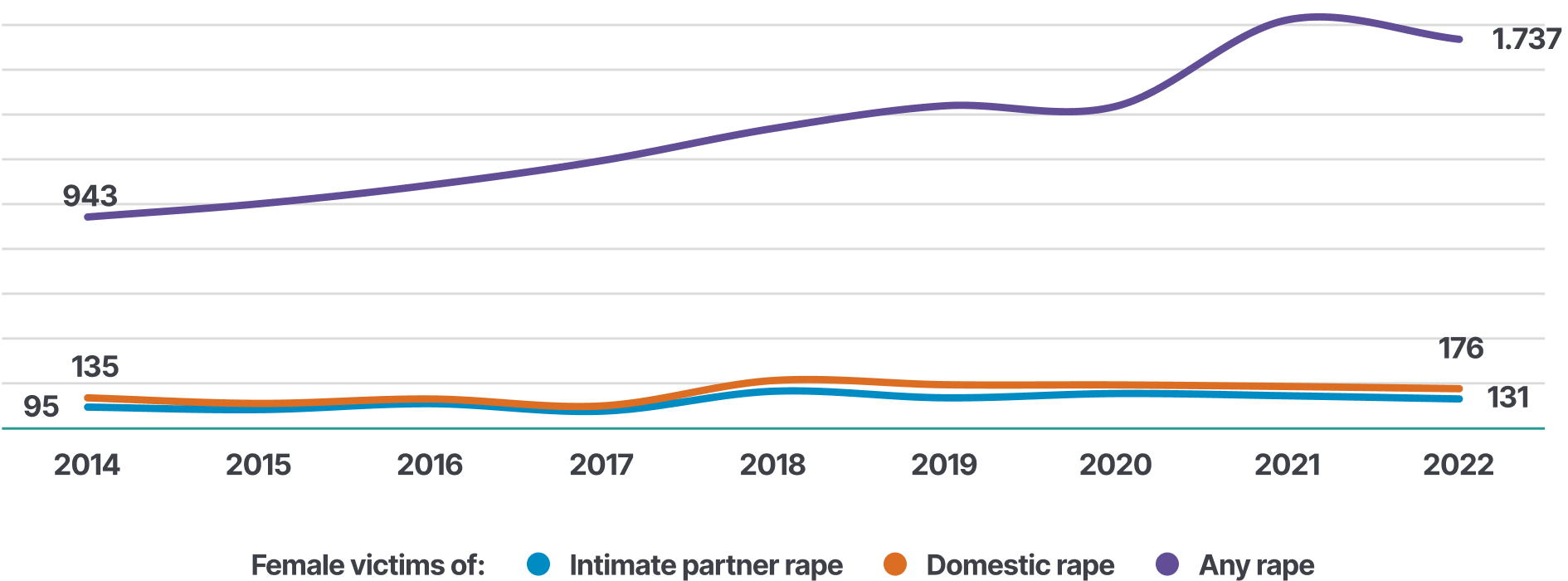 In 2022, 1737 women victims of rape were recorded by the police. In the same year, police recorded 176 women victims of domestic rape, and 131 women victims of any rape.