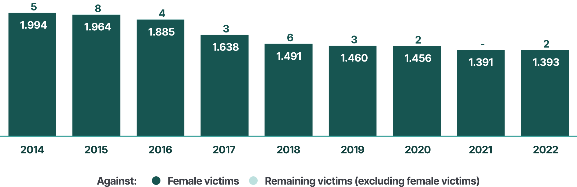In 2022, 23 women victims of homicide were recorded by the police. In the same year, police recorded 13 women victims of domestic homicide, and 8 women victims of intimate partner homicide.