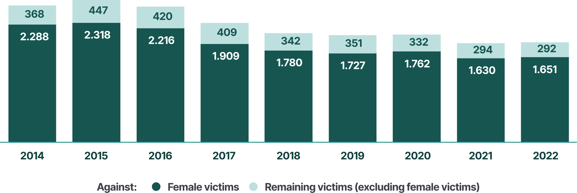 It should be noted that the data on intimate partner violence excludes victims and perpetrators who do not officially live together, are not married, or do not have a common child. As a result, the figures do not account for victims of intimate partner rape by ‘unofficial’ partners, such as boyfriends they do not live with.