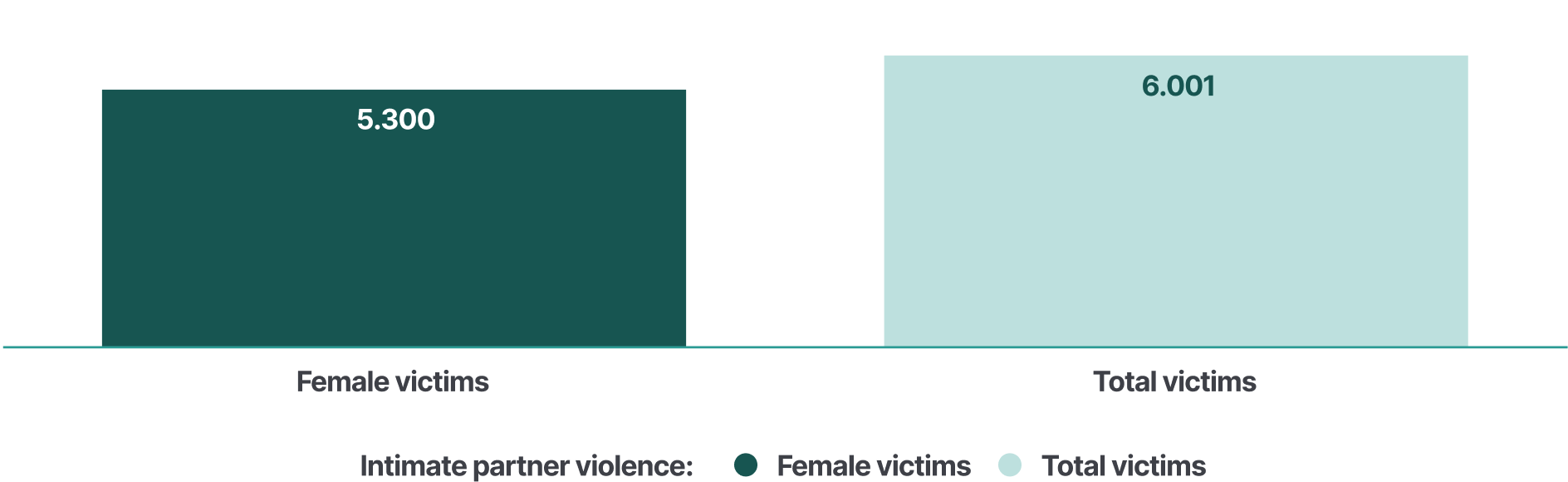 In Ireland, women represent the majority (88%) of victims of intimate partner violence recorded by police in 2022. Police recorded 5,300 women victims of violence committed by an intimate partner (out of 6,001 total victims).