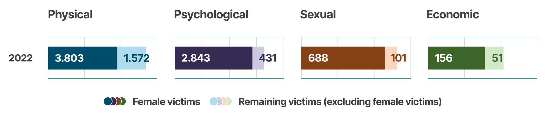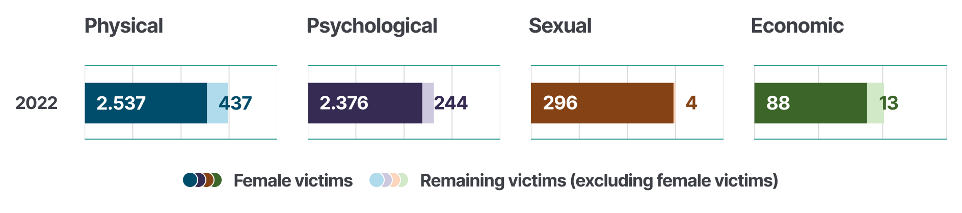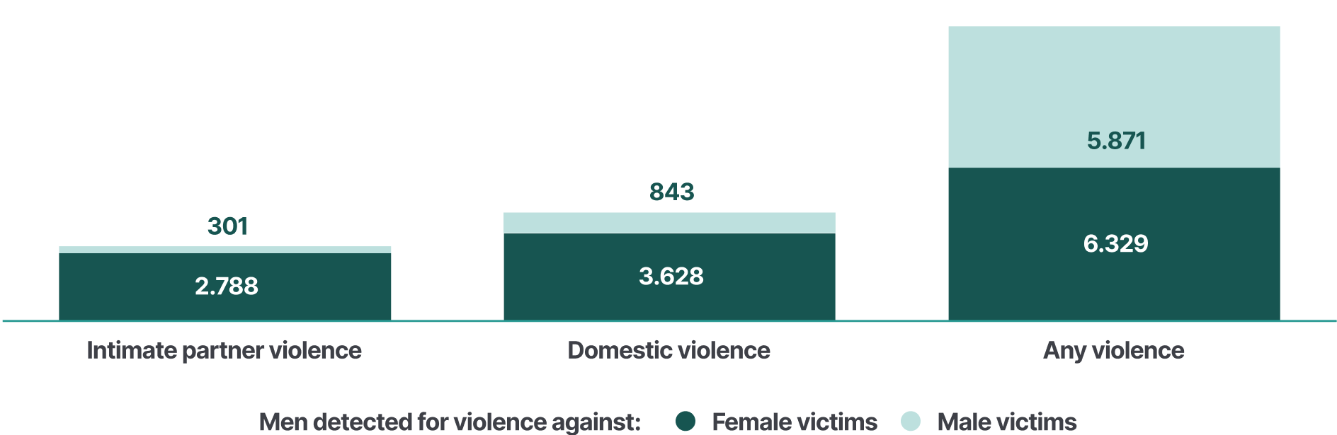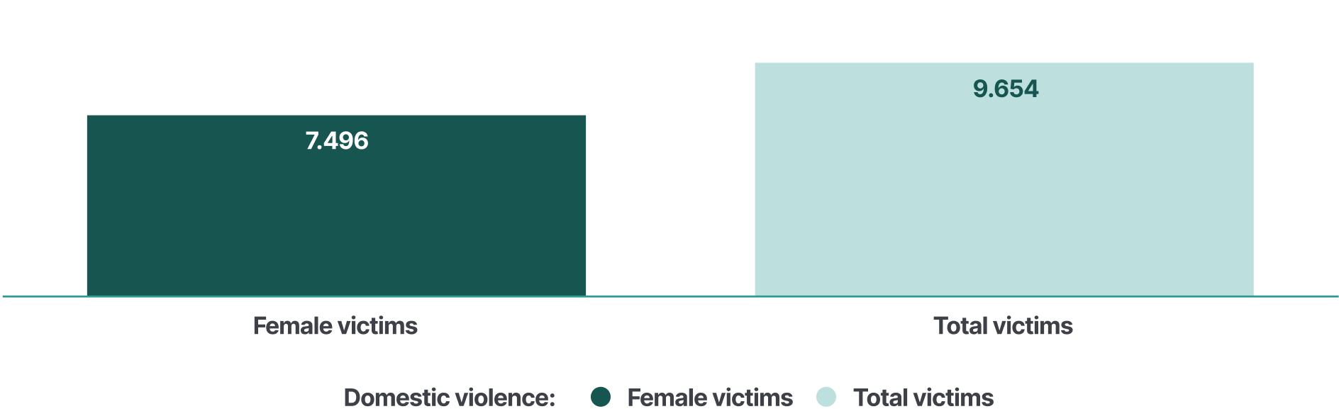 In 2022, 90 % of men detected by police for reported intimate partner violence committed those crimes against women (2,788 out of 3,089). In the same year, 81 % of men detected for reported domestic violence committed crimes against women (3,628 out of 4,471).