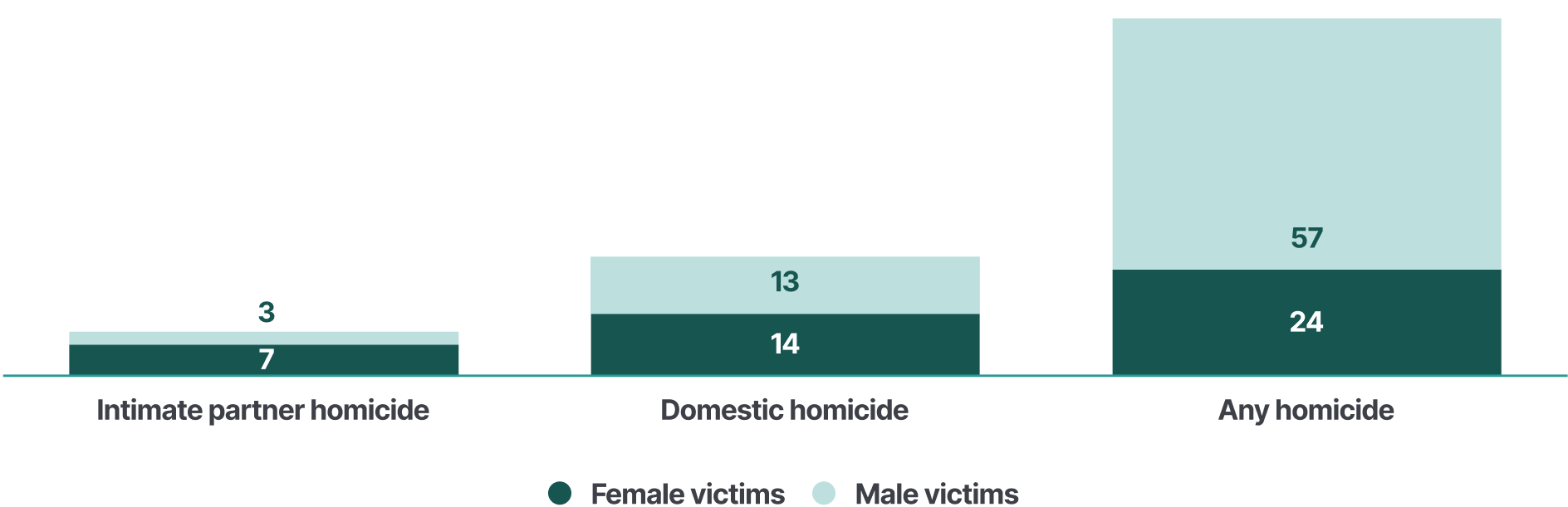 In 2022, women represented 70 % of recorded victims of intimate partner homicide (7 out of 10), and 52 % of recorded victims of domestic homicide (14 out of 27). During the same year, women comprised a smaller share of homicide victims overall (30%, 24 out of 81).