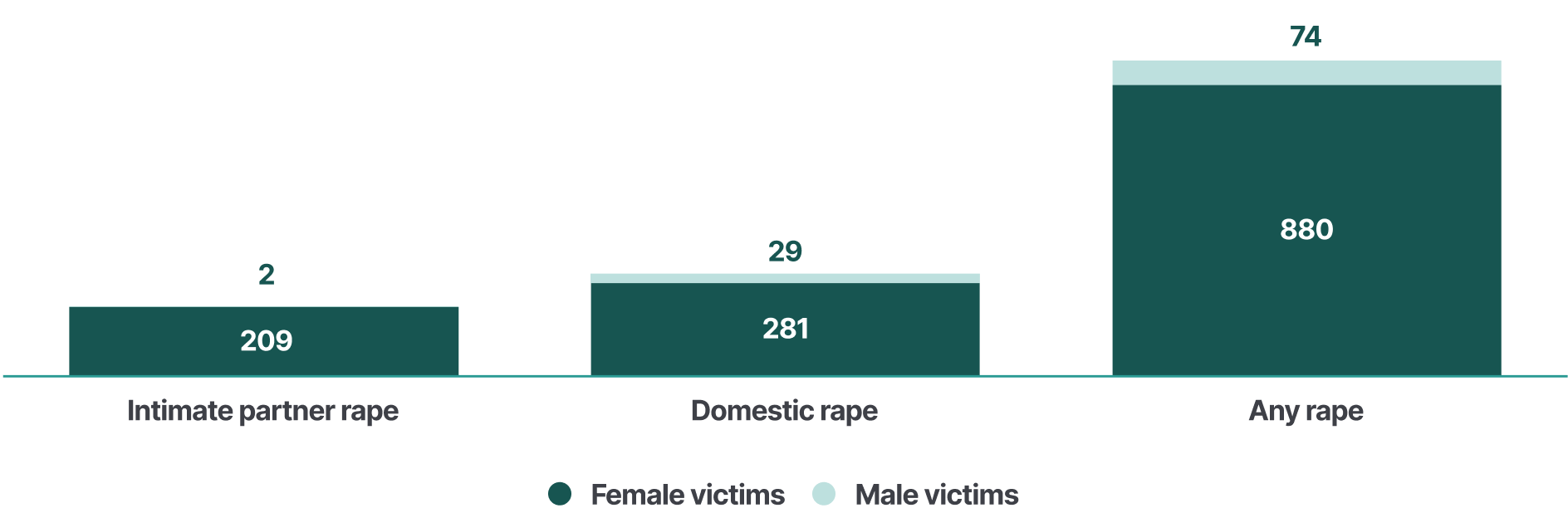 In 2022, women represented 99 % of victims of intimate partner rape recorded by police (209 out of 211). In the same year, women comprised 91 % of recorded victims of domestic rape (281 out of 310), and 92 % of recorded victims of any rape (880 out of 954).