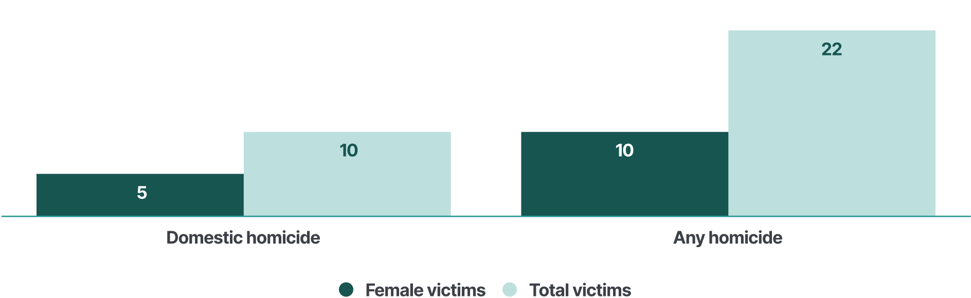 In the same period, police recorded 10 women victims of homicide committed by any perpetrator. Between 2018 and 2022, women comprised 45 % of homicide victims killed by any perpetrator (10 out of 22).