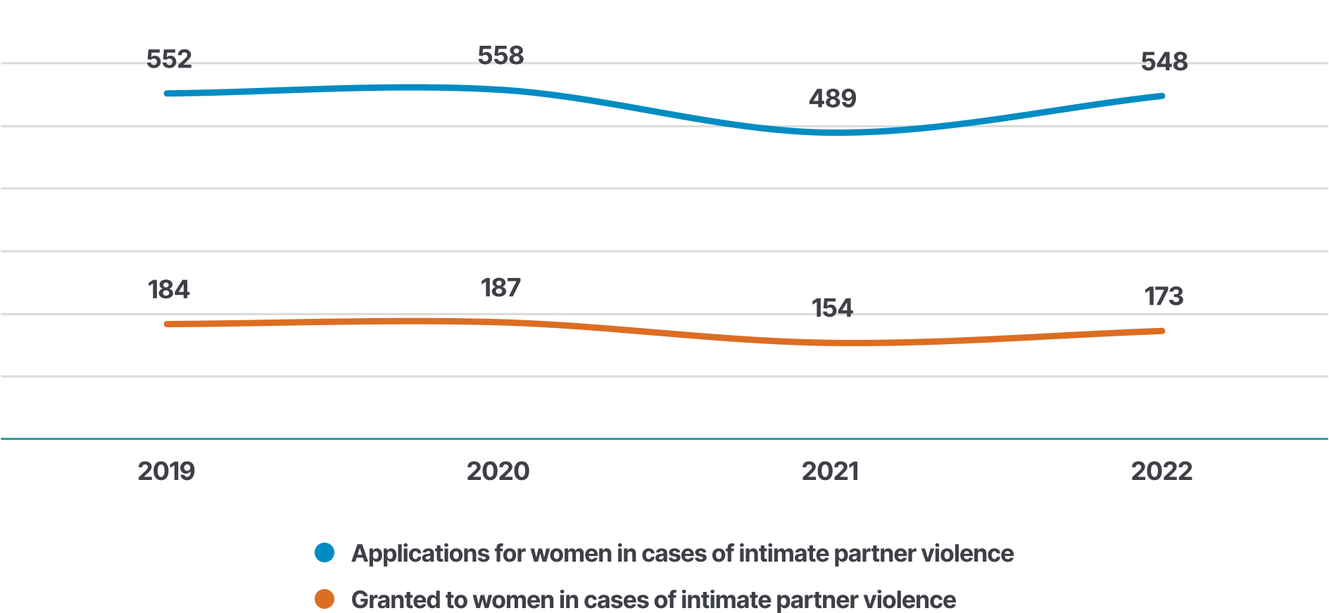 In 2022, 548 protection order applications were filed for women in cases related to intimate partner violence. During the same year, 173 protection orders were granted to women in cases involving intimate partner violence.
