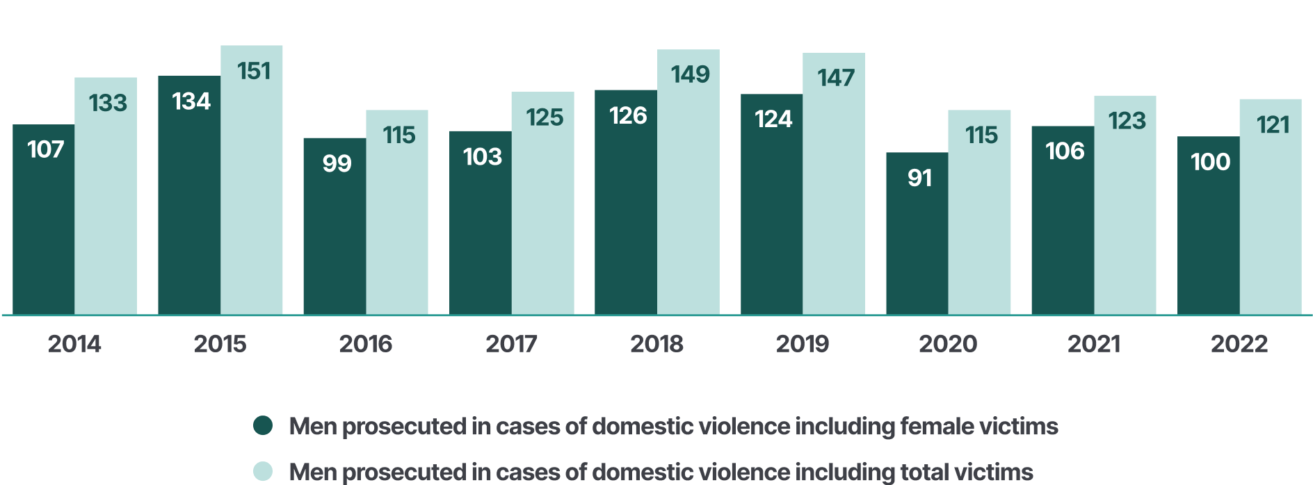 In 2022, 121 men were prosecuted for domestic violence. Of these men, 100 were prosecuted for domestic violence in cases that included women victims.