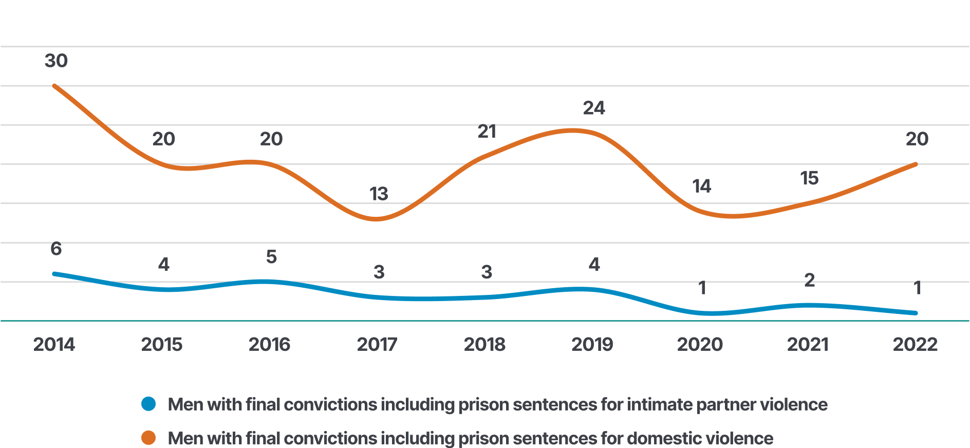 Data from the justice sector shows one male perpetrator with a final conviction including a prison sentence for intimate partner violence in the year 2022. In the same year, 20 men had final convictions which included prison sentences for domestic violence.