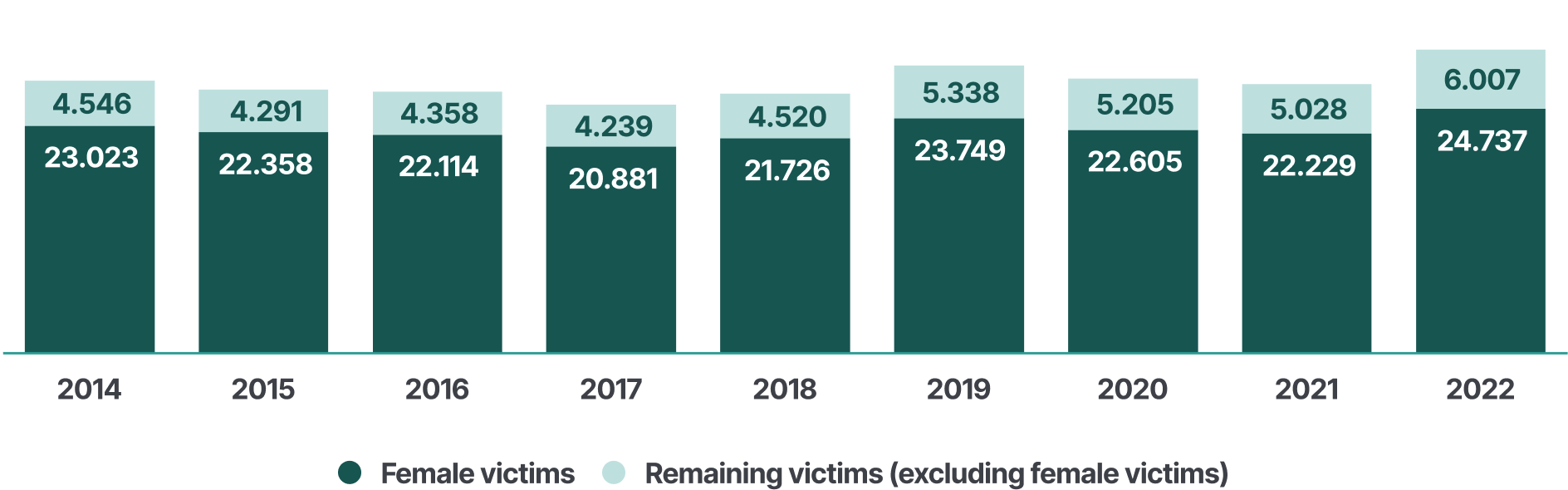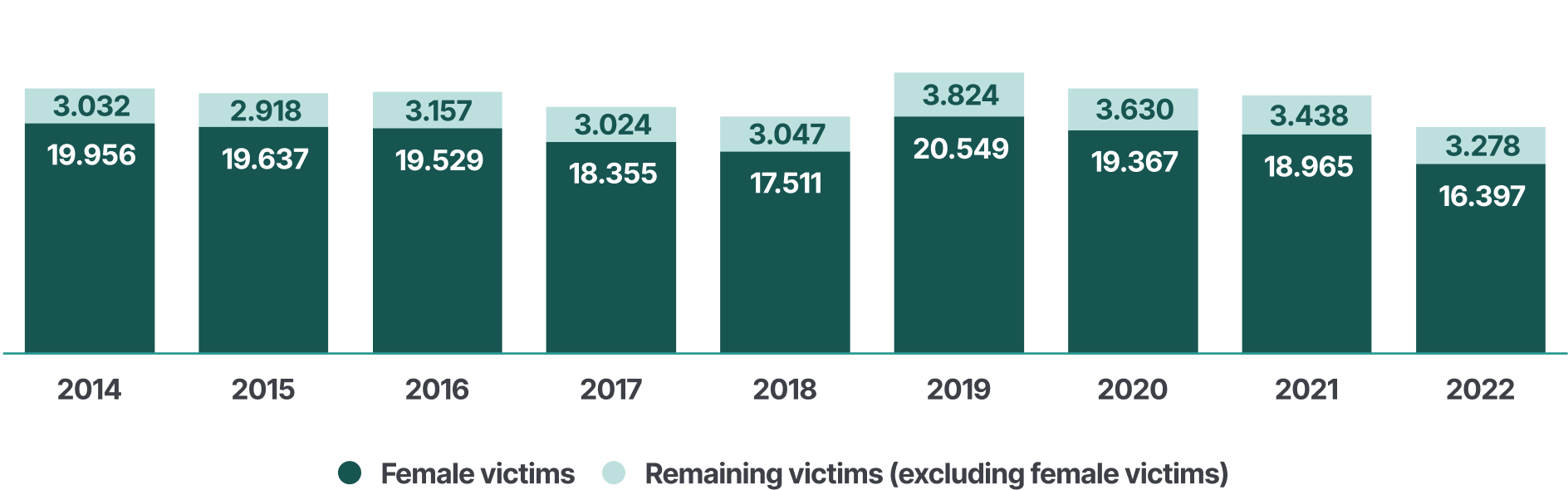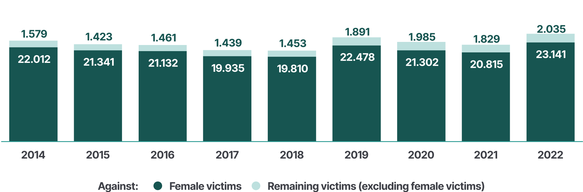 The following figure presents the annual number of female victims of homicide committed by intimate partners and domestic perpetrators between 2014-2022.