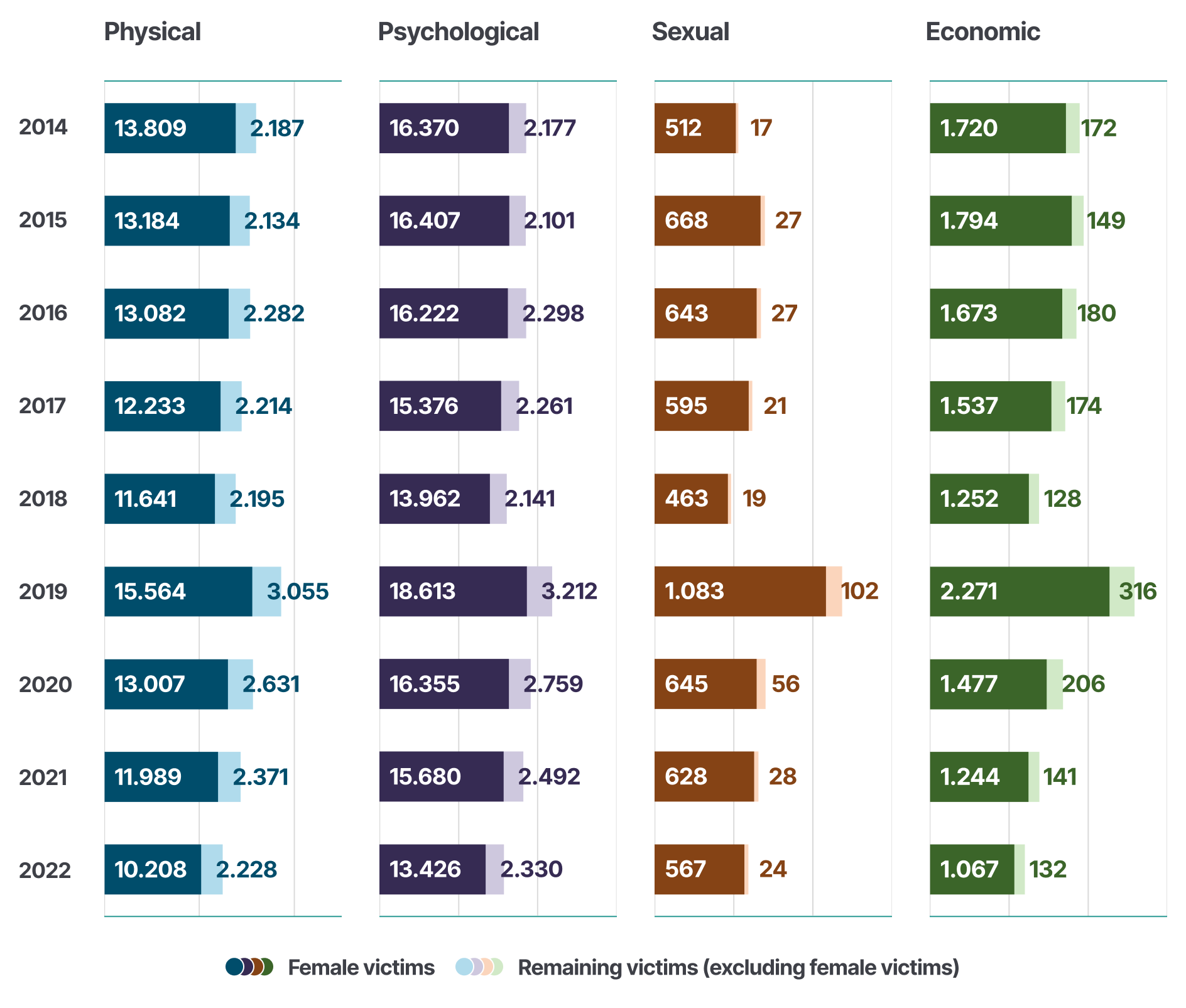 Figure 5 Annual number of female and total victims of physical, psychological, sexual, and economic domestic violence (Indicators 4-7), 2014-2022