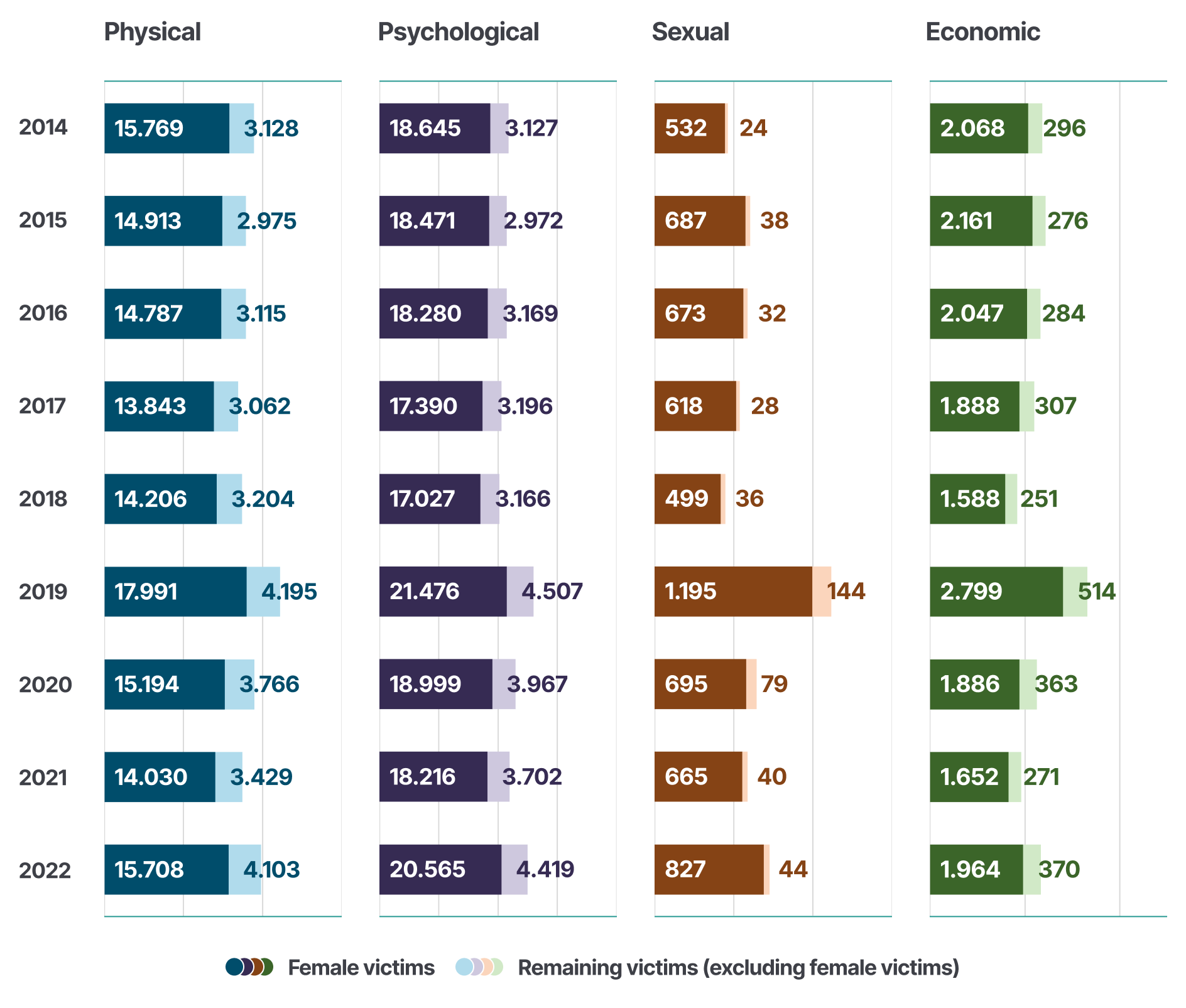 Figure 3 Annual number of female and total victims of physical, psychological, sexual, and economic domestic violence committed by intimate partners (Indicators 4-7), 2014-2022