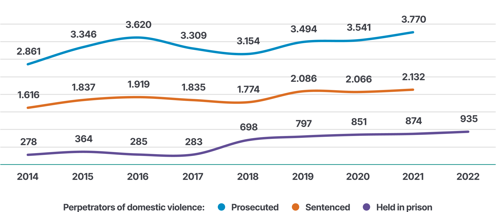 Figure 11 Annual number of male perpetrators prosecuted, sentenced, and held in prison for domestic violence against total victims (2014-2022)