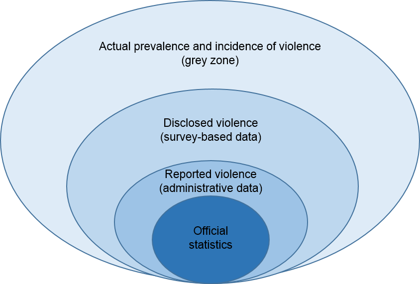 The difference between actual prevalence and incidence of violence on one hand, and disclosed violence recorded by sample surveys on the other can be known as the ‘grey zone’, as illustrated below.